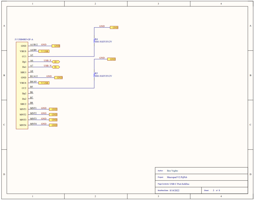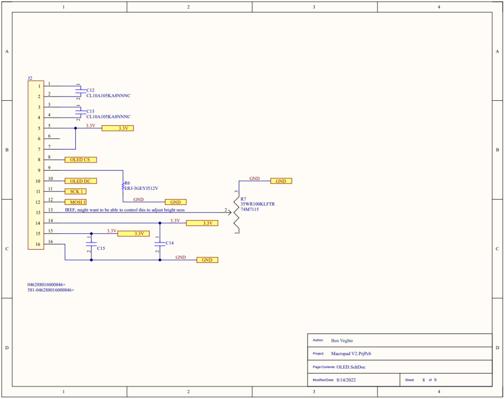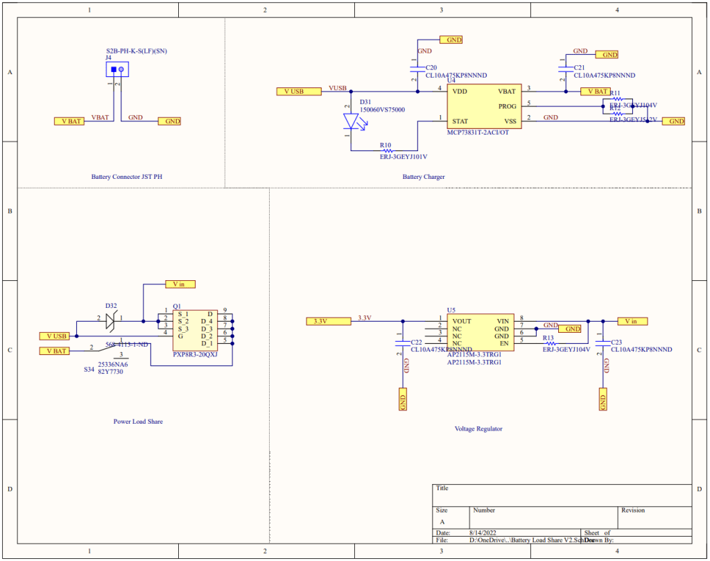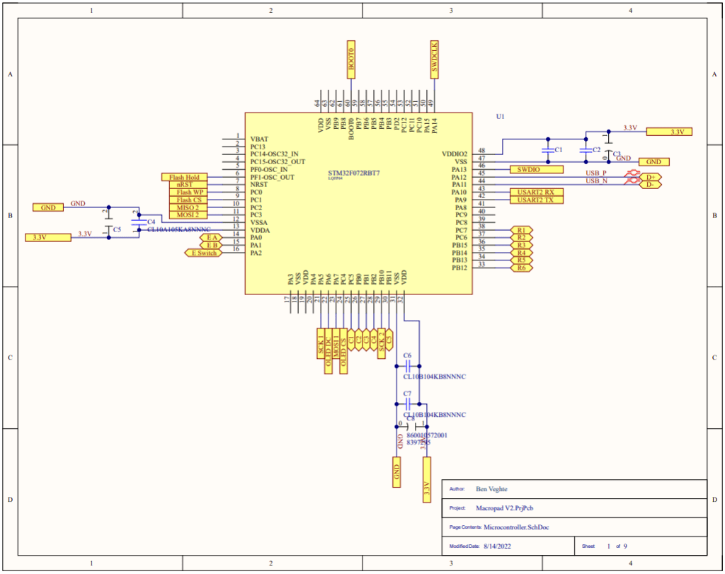 One particular aspect of this project I am particularly proud of is the load sharing circuit. One design requirement I had was that the macropad was wireless so I wouldn’t have to have it plugged in at all times, and I wanted it to work while plugged in. To do this I designed the circuit, the schematic of which is below, that automatically switched from battery to USB power when it was plugged in and back once done charging seamlessly. My one issue with this is that I selected a MOSFET with a slightly unusual package so if the part was out of stock, I was going to have a hard time replacing it.