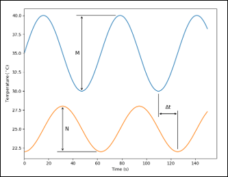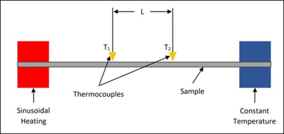 A thin sample is heated sinusoidally on one end and kept at a constant temperature on the other end. Along the sample, 2 thermocouples with a known separation distance L record the temperature as heat travels across the sample. If heat moves 1-dimensionally through the sample, the amplitude and phase shift of the thermocouple measurements can be used to compute the thermal diffusivity of the sample material, which can then be used to calculate thermal conductivity.