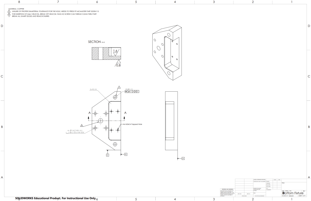 In order to get parts machined by the machine shop on campus we had to submit drawings calling out any critical tolerances. Some of ours required GD&T and quick tolerance stack up calculations. Aaron Leach and I had the most experience with machining out of anyone in our group, so we contributed to the DFM of all components. In addition, I was responsible for making a majority of the drawings of the machined parts and doing the final checks on the ones I didn’t make.